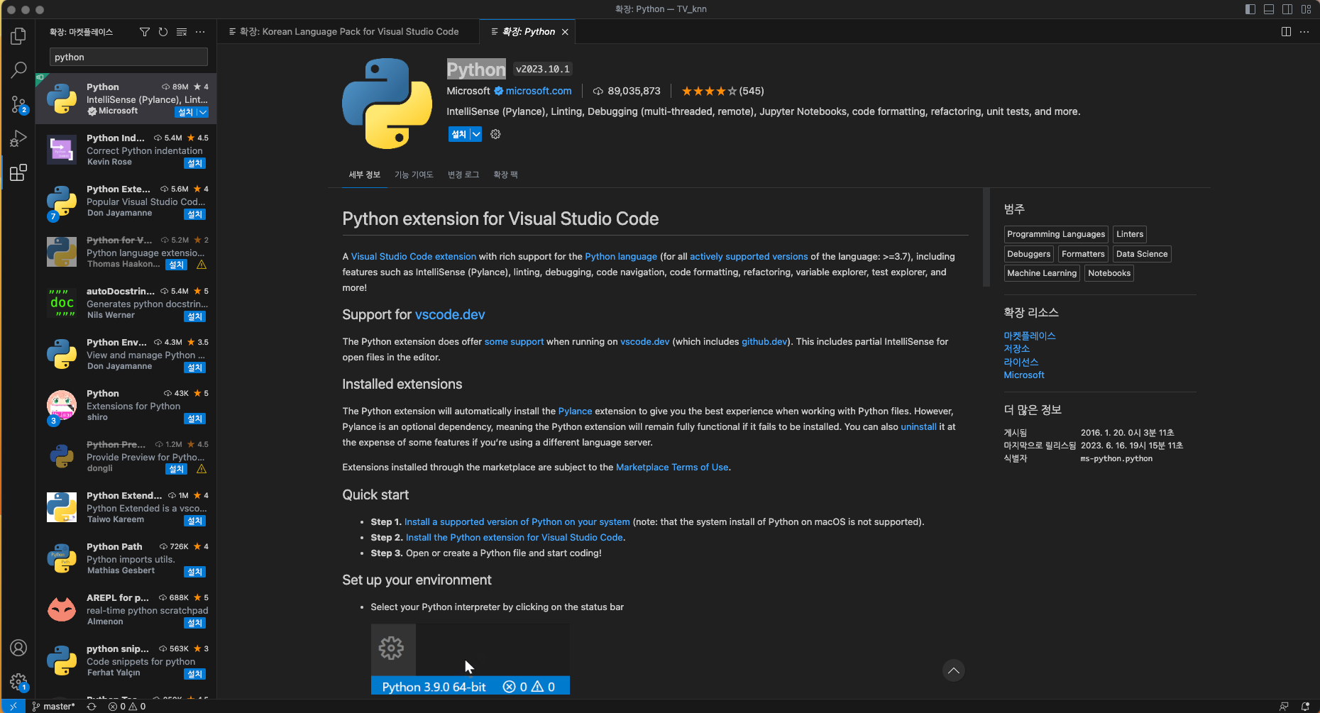 brew install --cask visual-studio-code - install vscode extenstion : Python, Python Extension Pack